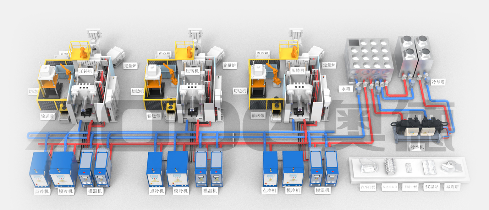 2.壓鑄溫控島一站式交付:模溫機(jī),點(diǎn)冷機(jī),模冷機(jī),冷水機(jī),純水機(jī),模具管道清洗機(jī).